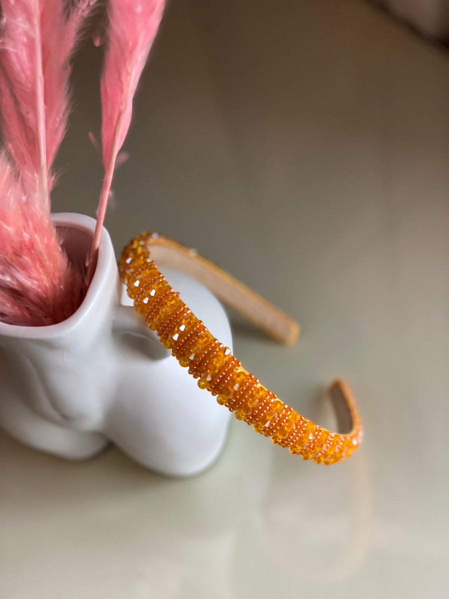 Add some glamour to any look with this gorgeous skinny headband in Tiger Orange. This headband is covered in diamantes that will leave a sparkle wherever you go. Style with straight or or your hair waved for a super glamorous look.